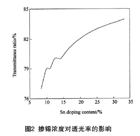 圖2為摻雜濃度對(duì)ITO薄膜透光率(λ=550nm)的影響關(guān)系曲線。ITO薄膜透光率隨著錫摻雜濃度增加,逐漸增大,ITO薄膜中錫離子含量的增加有利于提高ITO薄膜的透光率。