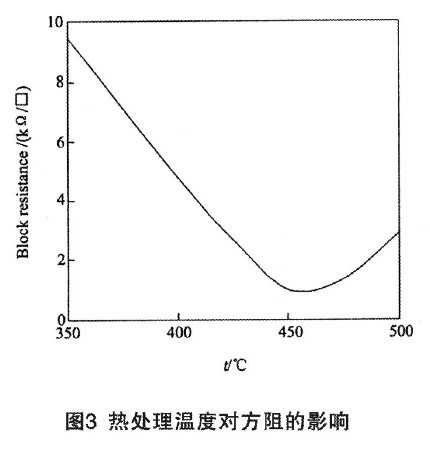 圖3為熱處理溫度對(duì)ITO薄膜的方阻影響關(guān)系曲線。熱處理溫度較低時(shí)ITO薄膜方阻較高,隨著熱處理溫度的增加ITO薄膜的方阻直線下降,熱處理溫度達(dá)到450℃時(shí)ITO薄膜方阻降為最低,熱處理溫度高于450℃后ITO薄膜方阻由減小轉(zhuǎn)為增加。熱處理溫度較低時(shí),ITO薄膜晶粒較小,方阻較大;隨著熱處理溫度的升高,ITO薄膜晶粒增大,有利于方阻的下降;當(dāng)熱處理溫度接近500℃附近時(shí)晶格畸變嚴(yán)重,抵消了晶粒增大有利于方阻下降的影響,導(dǎo)致熱處理溫度超過450℃后,ITO薄膜方阻轉(zhuǎn)為增加。