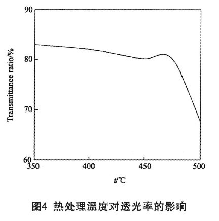 圖4為熱處理溫度對(duì)ITO薄膜透光率(λ=550nm)的影響關(guān)系曲線。熱處理溫度對(duì)透光率的影響在熱處理溫度為475℃之前并不大,當(dāng)熱處理溫度高于475℃之后透光率隨熱處理溫度的增高迅速下降。