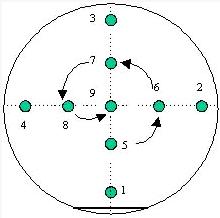 其實(shí)外延片的生產(chǎn)制作過程是非常復(fù)雜的,生產(chǎn)設(shè)備基本上選用原裝進(jìn)口為主;在展完外延片后,下一步就開始對LED外延片做電極(P極,N極),接著就開始用激光機(jī)切割LED外延片(以前切割LED外延片主要用鉆石刀),制造成芯片后,在晶圓上的不同位置抽取九個點(diǎn)做參數(shù)測試,如圖所示:
