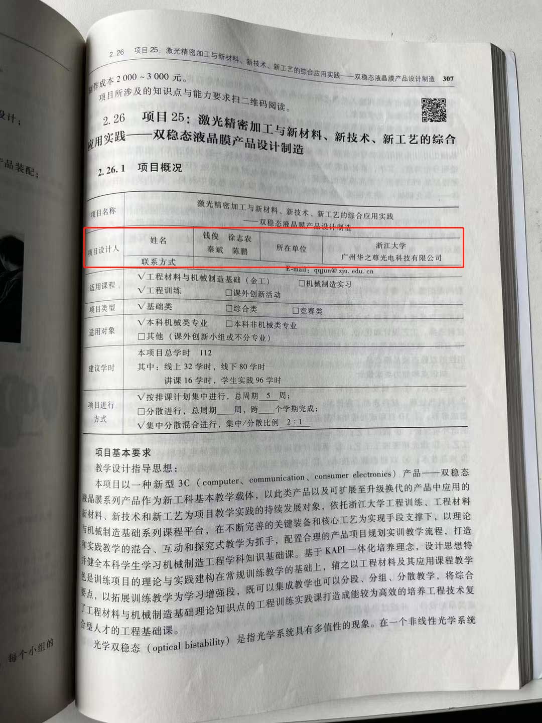 激光精密加工與新材料、新技術、新工藝的綜合應用實踐—雙穩(wěn)態(tài)液晶膜產品設計制造項目是由浙江大學和廣州華之尊光電科技有限公司基于新材料、新技術、新工藝共同推出的新型教材。項目以新型3C產品一雙穩(wěn)態(tài)液晶膜系列產品作為新工科基本教學教體,項目依托浙江大學工程訓練、工程材料與機械制造基礎系列課程平臺,在不斷完善的關鍵裝備和核心工藝為實現(xiàn)手段支撐下,以理論和實踐教學的混合、互動和探究式教學為抓手,配置合理的產品項目規(guī)劃實訓教學流程,打造并健全本科學生學習機械制造工程學科知識基礎課?;贙API一體化培養(yǎng)理念,設計思想特色是訓練項目的理論與實踐建構在常規(guī)訓練教學的基礎上,輔之以工程材料及其應用課程教學要點,以拓展訓練教學為學習增強段,既可以集成教學也可以分段、分組、分散教學,將綜合了工程材料與機械制造基礎理論知識點的工程訓練實踐課打造成能較為高效的培養(yǎng)工程技術復合型人才的工程基礎課。