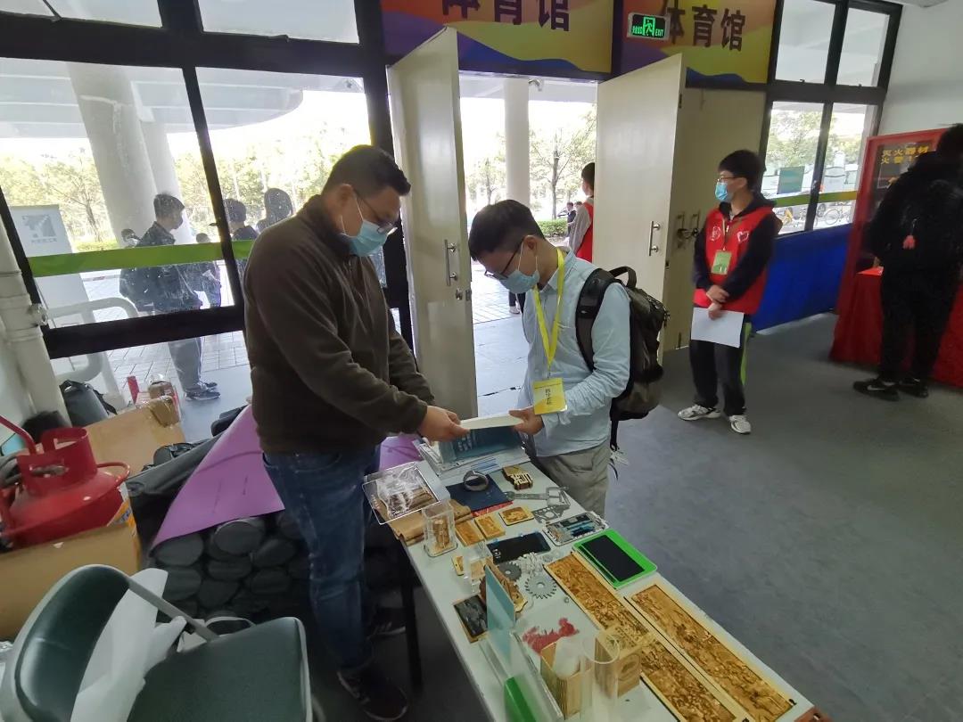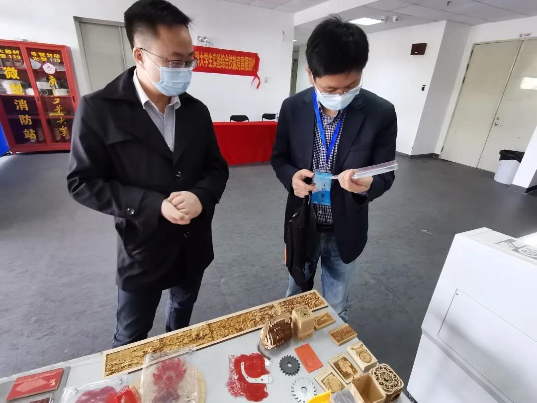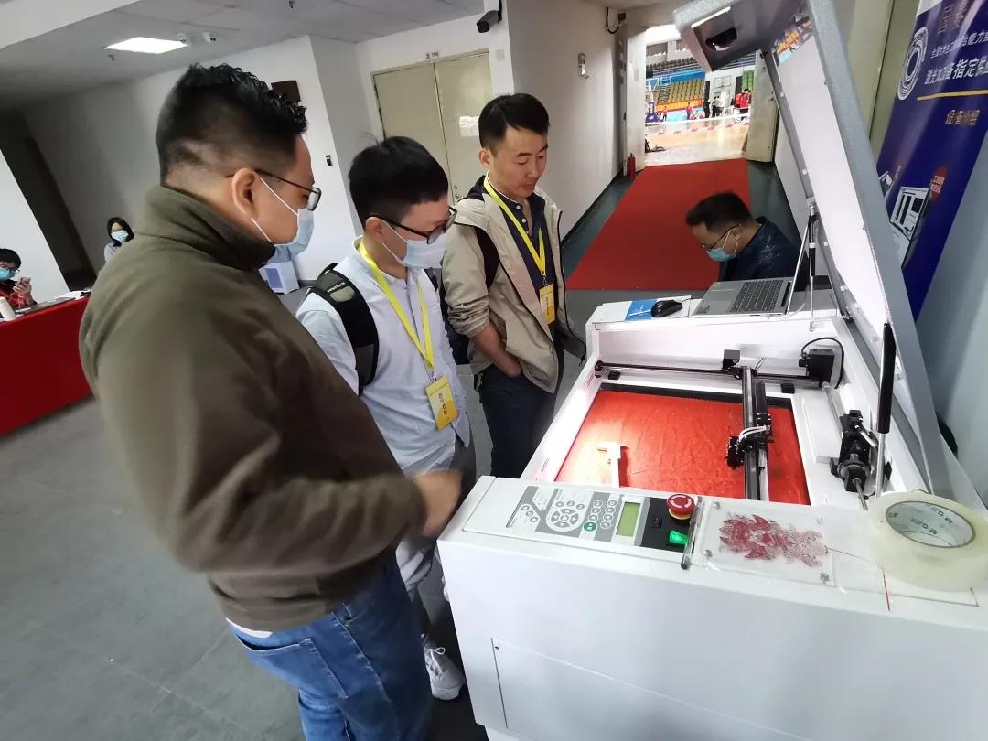 向參觀者演示機器切割剪紙。華之尊激光設備光斑極細,激光與卡紙的接觸面積極小,從而在切割過程中不會產(chǎn)生發(fā)黑、發(fā)黃、起火及碳化等效果,切割R弧可達0.2mm,切縫小于0.03mm,能將平面圖案通過華之尊激光精確切割出來。