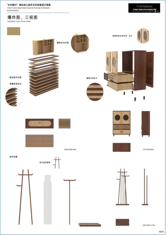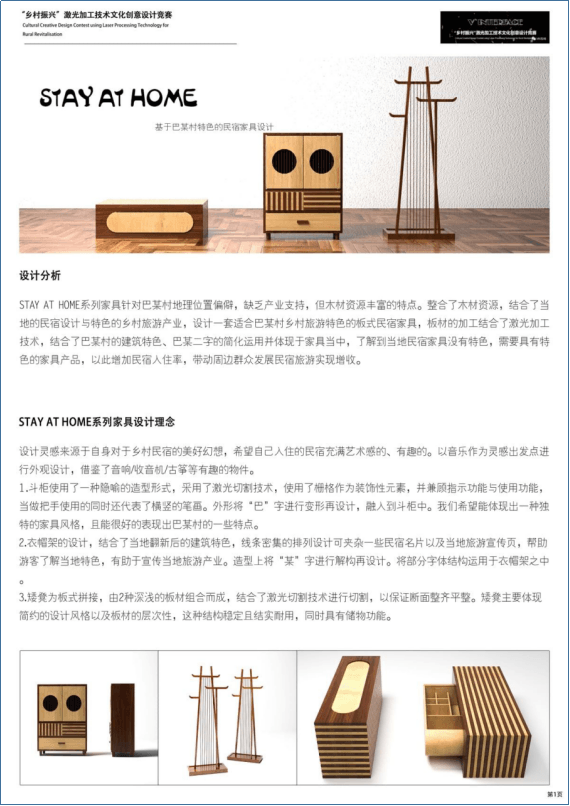 AT HOME系列家具針對巴某村地理位置偏僻、缺乏產(chǎn)業(yè)支持,但木材資源豐富的特點,整合了木材資源,結合了當?shù)氐拿袼拊O計與特色的鄉(xiāng)村旅游產(chǎn)業(yè),設計一套適合巴某村鄉(xiāng)村旅游特色的板式民宿家具。板材的加工結合了激光加工技術、巴某村的建筑特色和“巴某”二字的簡化,運用并體現(xiàn)于家具當中。以此增加民宿入住率,帶動周邊群眾發(fā)展民宿旅游實現(xiàn)增收。