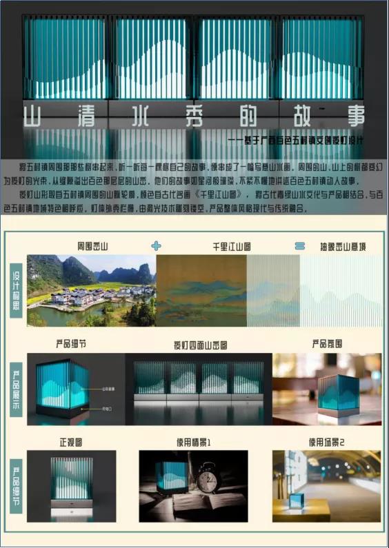 產(chǎn)品介紹:夜燈山形取自五村鎮(zhèn)周圍的山脈輪廓,顏色取自古代名畫《千里江山圖》,將古代青山綠水文化與產(chǎn)品相結合,與百色五村鎮(zhèn)地域特色相呼應。燈體外殼欄柵,有激光技術雕刻鏤空,產(chǎn)品整體風格現(xiàn)代與傳統(tǒng)融合。