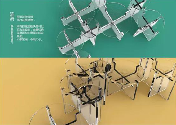 產(chǎn)品介紹:兩款組合方式,雙桌面和三桌面組合。除此以外可以將兩組邊幾的部件多數(shù)組合,形成高低錯落的群組 合,就像落雨的湖面,漣漪朵朵。單組作為邊幾,適用于多種風格空間,群組合視空間大小自由調(diào)整,亦適用于多種空間。以透明亞克力為材料,切割基型雕刻漣漪水紋,一共5片部件,組合成簡單、便巧的邊幾,可以是單組呈現(xiàn),也可以是多件組合成片,呈現(xiàn)不同效果,可以配合多種使用場景,也可搭配多種風格