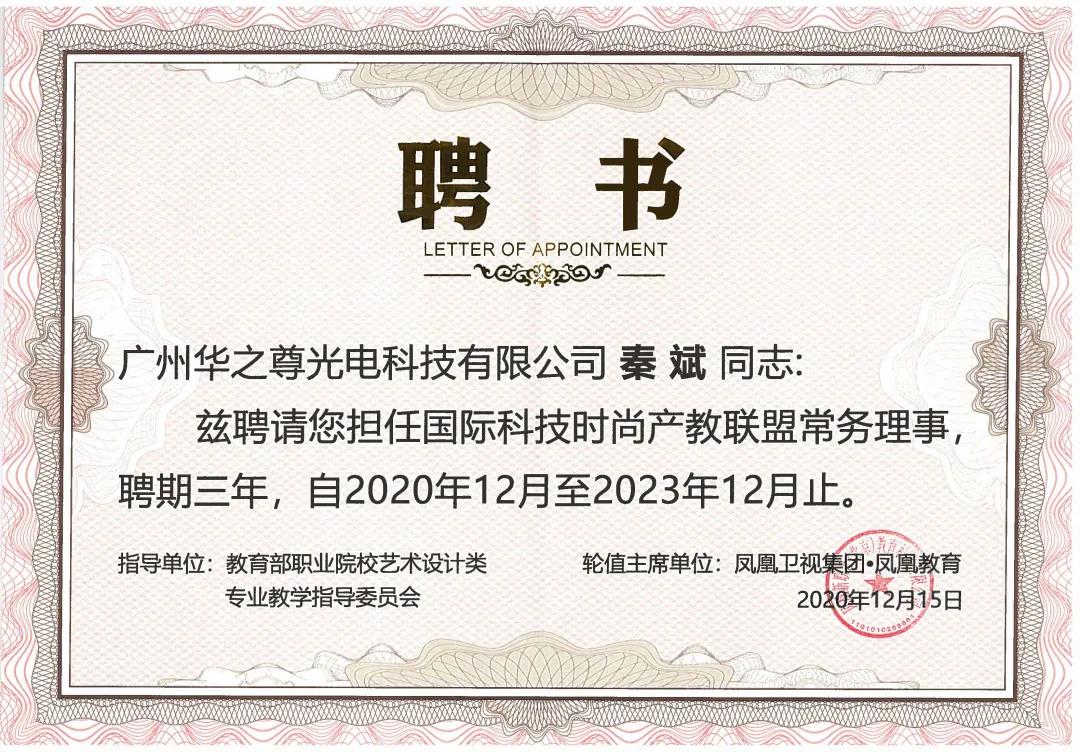 教育向善,共生未來!世界因你而溫暖!廣州華之尊光電科技有限公司榮獲國際科技時尚職業(yè)教育集團常務理事單位。華之尊激光秦斌總經(jīng)理榮獲“雙高”建設項目——廣州番禺職業(yè)技術(shù)學院設計專業(yè)群建設指導委員會委員、國際科技時尚產(chǎn)教聯(lián)盟商務理事。