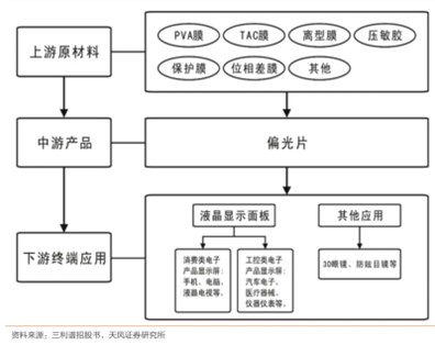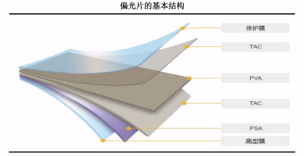 偏光片的全稱是偏振光片,是一種具有特殊光學特性的材料,能夠選擇性地吸收、透射或反射特定方向的光線,從而實現(xiàn)光的偏振作用。主要由TAC膜、PVA膜、保護膜、增量膜、壓敏膠、相位差膜等復合而成,具有高度透明性和柔韌性?;窘Y(jié)構(gòu)是兩層TAC膜,夾一層拉伸后的PVA膜。通過調(diào)整不同的膜材料構(gòu)成可以滿足偏光片的高耐性、不同厚度等要求。