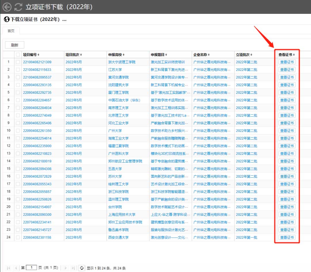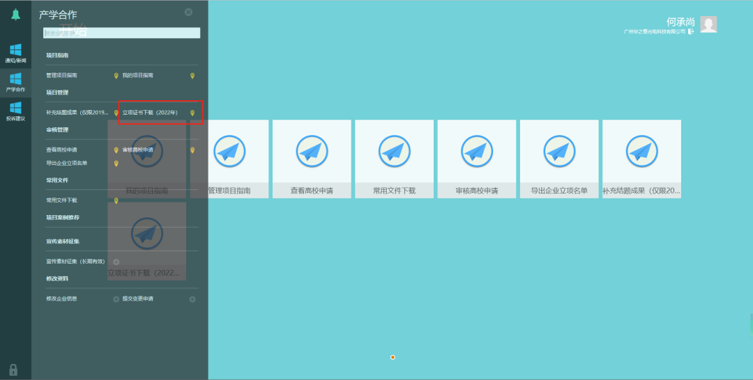 已成功立項(xiàng)的項(xiàng)目可登錄項(xiàng)目平臺(tái),通過“產(chǎn)學(xué)合作”—“立項(xiàng)證書下載(2022年)”頁面查看項(xiàng)目立項(xiàng)情況并下載立項(xiàng)證書。(詳情見下圖)